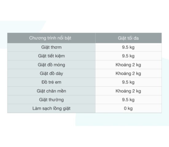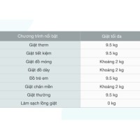 Chương trình giặt: Chăn mền, Giặt thơm, Giặt thường, Giặt tiết kiệm, Vệ sinh lồng giặt, Đồ dày, Đồ mỏng, Đồ trẻ em