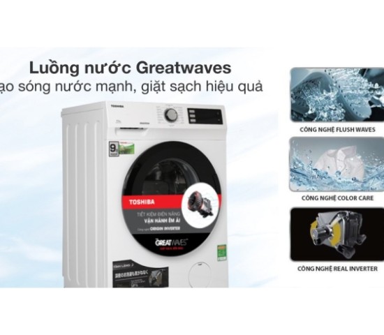 Máy giặt Toshiba Inverter 9.5 Kg TW-BK105S2V(WS) được tích hợp công nghệ siêu sóng Greatwaves độc quyền của Toshiba, mang lại sức mạnh siêu sóng đánh bật vết bẩn cứng đầu cũng như giảm đến 39% độ phai màu của quần áo sau khi giặt. Greatwaves tích hợp 3 công nghệ tiên tiến của Toshiba là: Real Inverter - giúp tiết kiệm điện hiệu quả, Flush Waves - giặt sạch với sóng nước mạnh mẽ và Color Care - chống phai màu quần áo.