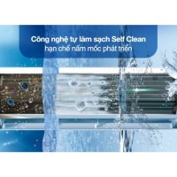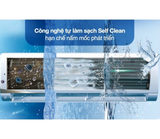 - Chức năng tự làm sạch dàn lạnh Self Clean: Điều hòa tự động làm sạch theo quy trình 3 bước gồm có đóng băng, rã băng để loại bỏ bụi bẩn cùng với vi khuẩn đến 99.9%, rồi tiến hành hong khô dàn lạnh để duy trì độ bền cũng như tăng cường khả năng hoạt động của điều hòa.