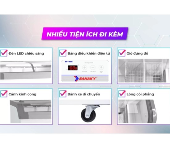 Đèn LED chiếu sáng giúp màu sắc thực phẩm trong tủ thêm hấp dẫn: Tủ đông Sanaky được thiết kế với hệ thống đèn LED trong thân tủ, chiếu sáng toàn bộ các góc khuất giúp trưng bày các sản phẩm bắt mắt và thu hút. Hơn nữa, hệ thống đèn LED còn tiết kiệm điện năng và có tuổi thọ bền bỉ hơn nhiều lần so với các loại đèn huỳnh quang, đèn sợi đốt,… mang lại giá trị sử dụng lâu dài cho người sử dụng.