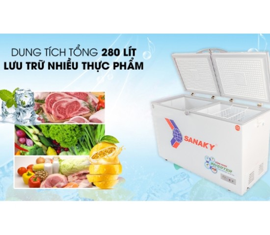 Tủ đông Sanaky với dung tích tổng 280 lít và chia làm 2 ngăn riêng biệt giúp bạn dễ dàng phân loại thực phẩm cần bảo quản: