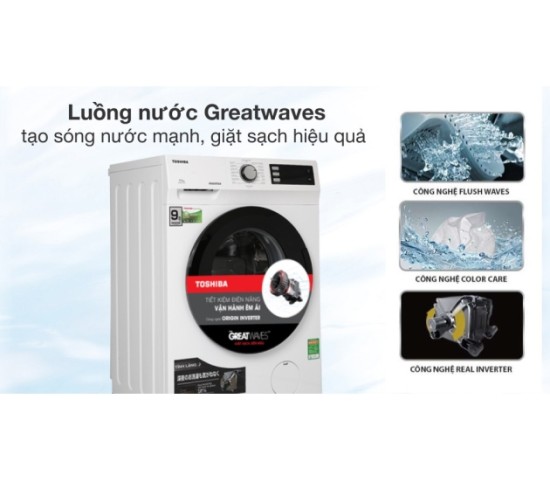Máy giặt Toshiba Inverter 9.5 Kg TW-BK105S2V(WS) được tích hợp công nghệ siêu sóng Greatwaves độc quyền của Toshiba, mang lại sức mạnh siêu sóng đánh bật vết bẩn cứng đầu cũng như giảm đến 39% độ phai màu của quần áo sau khi giặt. Greatwaves tích hợp 3 công nghệ tiên tiến của Toshiba là: Real Inverter - giúp tiết kiệm điện hiệu quả, Flush Waves - giặt sạch với sóng nước mạnh mẽ và Color Care - chống phai màu quần áo.