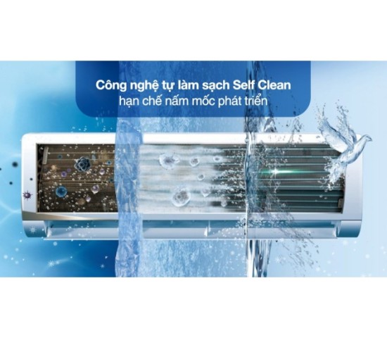 - Chức năng tự làm sạch dàn lạnh Self Clean: Điều hòa tự động làm sạch theo quy trình 3 bước gồm có đóng băng, rã băng để loại bỏ bụi bẩn cùng với vi khuẩn đến 99.9%, rồi tiến hành hong khô dàn lạnh để duy trì độ bền cũng như tăng cường khả năng hoạt động của điều hòa.
