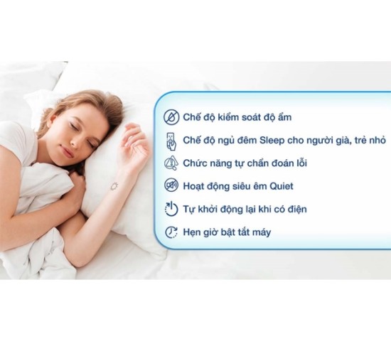 - Chế độ ngủ đêm Sleep: Điều hòa có khả năng tự động tăng nhiệt độ khi trời về đêm, giúp nhiệt độ căn phòng phù hợp với nhiệt độ cơ thể người nằm ngủ, từ đó tránh gây cảm giác lạnh buốt và mang lại giấc ngủ ngon cho người dùng. Chế độ này phù hợp cho người lớn tuổi, trẻ em và phụ nữ với cơ địa khá nhạy cảm.
