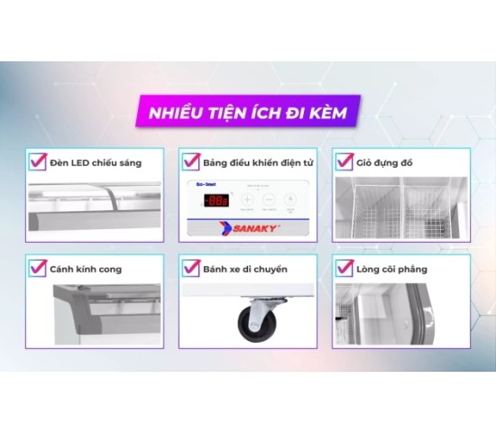 Đèn LED chiếu sáng giúp màu sắc thực phẩm trong tủ thêm hấp dẫn: Tủ đông Sanaky được thiết kế với hệ thống đèn LED trong thân tủ, chiếu sáng toàn bộ các góc khuất giúp trưng bày các sản phẩm bắt mắt và thu hút. Hơn nữa, hệ thống đèn LED còn tiết kiệm điện năng và có tuổi thọ bền bỉ hơn nhiều lần so với các loại đèn huỳnh quang, đèn sợi đốt,… mang lại giá trị sử dụng lâu dài cho người sử dụng.