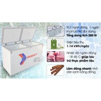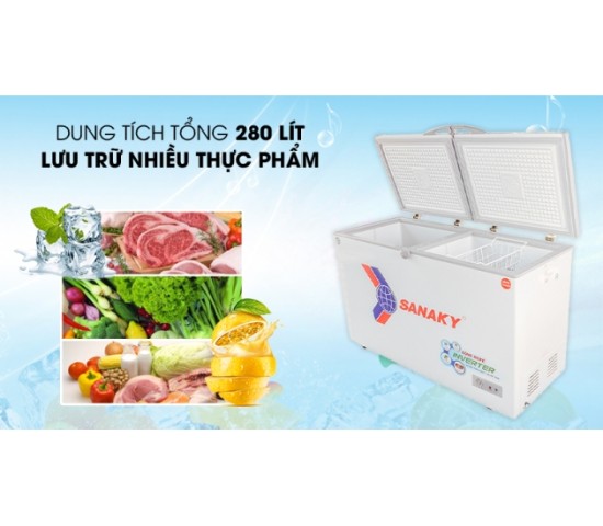 Tủ đông Sanaky với dung tích tổng 280 lít và chia làm 2 ngăn riêng biệt giúp bạn dễ dàng phân loại thực phẩm cần bảo quản: